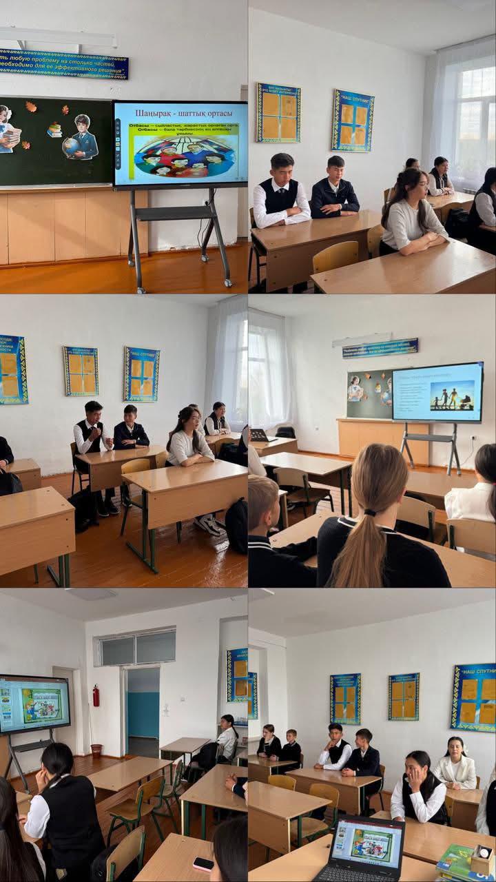 Мектебімізде "Шаңырақ- шаттық ортасы" тақырыбында сынып сағаты өтті. Мақсаты: отбасындағы әке мен ананың, баланың рөлін айқындау, ата-ананы сыйлауға қадірлеуге, татулыққа тәрбиелеу.