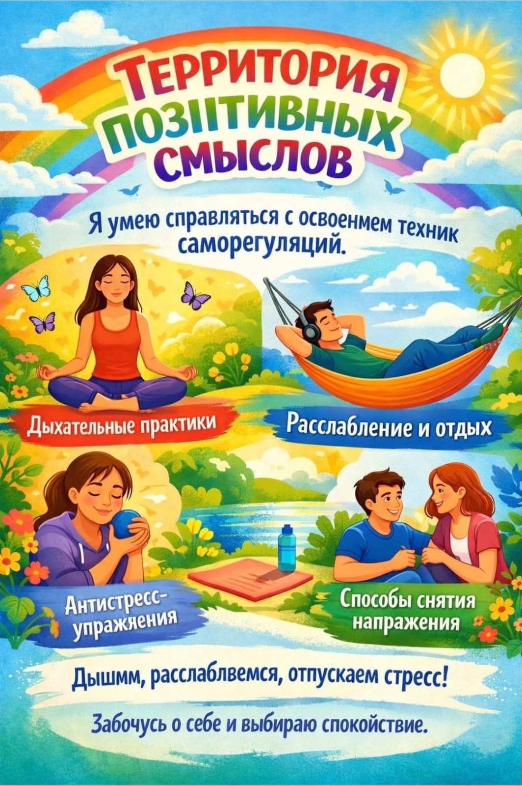 13.02.2026 ж. онкүндікке сәйкес: "Позитивті мағыналар аумағы","Мен жеңе аламын" күні. Бүгін біз сабырлы болуды үйренеміз. Тыныс алу, релаксация, стресске қарсы жеңіл жаттығулар — мұның бәрі өзіңізді жақсы және сенімді сезінуге көмектеседі. Мен денем мен эмоцияларымның қалай жұмыс істейтінін түсінемін және шиеленіскен кезде өзіме көмектесе аламын.