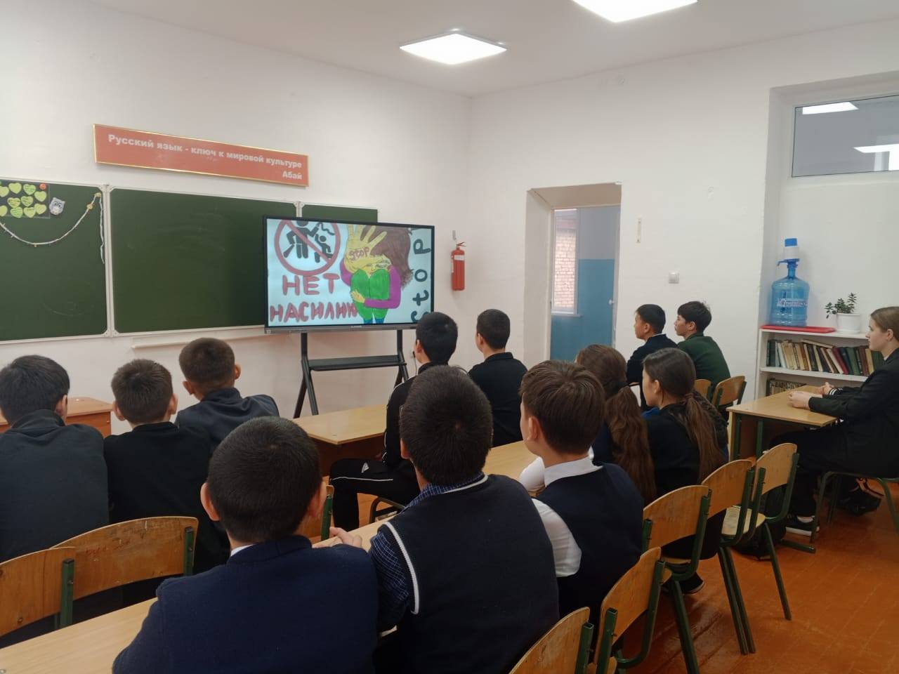 "Зорлық-зомбылыққа жол жоқ" тақырыбында 5-11 сынып оқушылары арасында әңгіме жүргізіліп, видео көрсетілді.